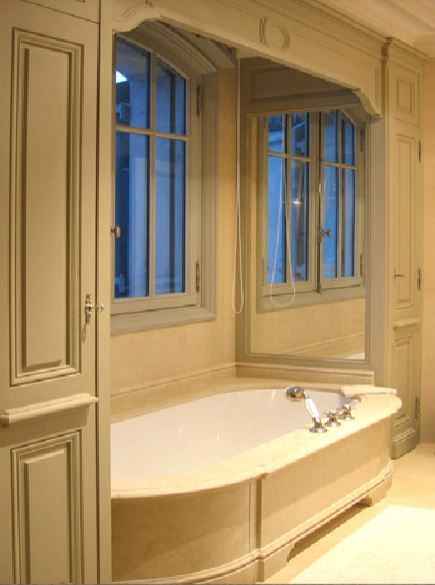 Alcôve galbée pour une baignoire encadrée de deux placards.